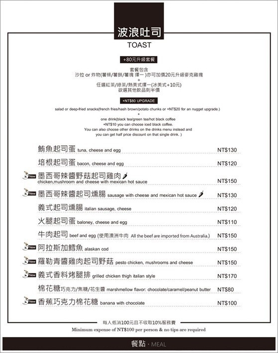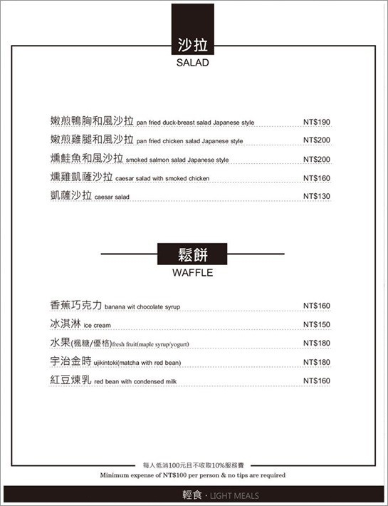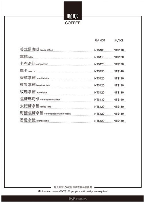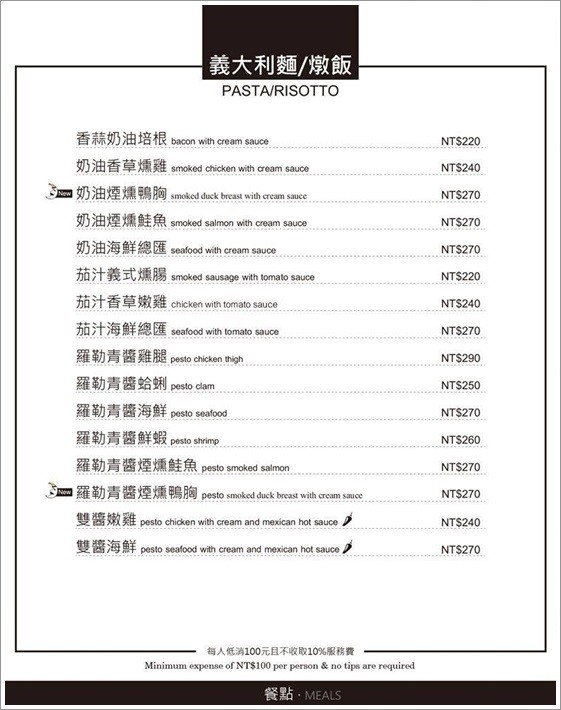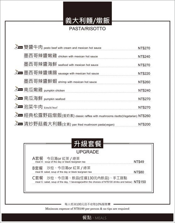 若點義大利麵或燉飯,可加價升級成套餐,加49或80或150,有不同的套餐內容,個人建議直接加$150選C套餐,沙拉、湯、飲料和甜點都有了,而且飲料可任選$130以內的飲料。