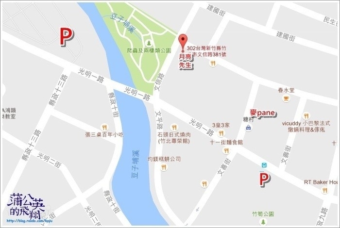 『月亮先生』在竹北文化中心附近,屬光明美食商圈,我們下交流道後經光明一路往文化中心方向,在即將到竹北週日夜市的大停車場前,會看到文信路指標,右轉後『月亮先生』就在轉角處。
