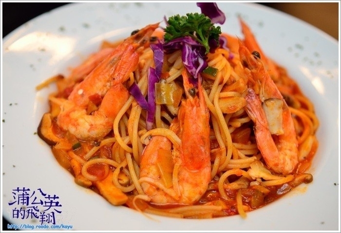 首先,六隻體型碩大的鮮蝦盤鋸在堆得高高的義大利麵上。