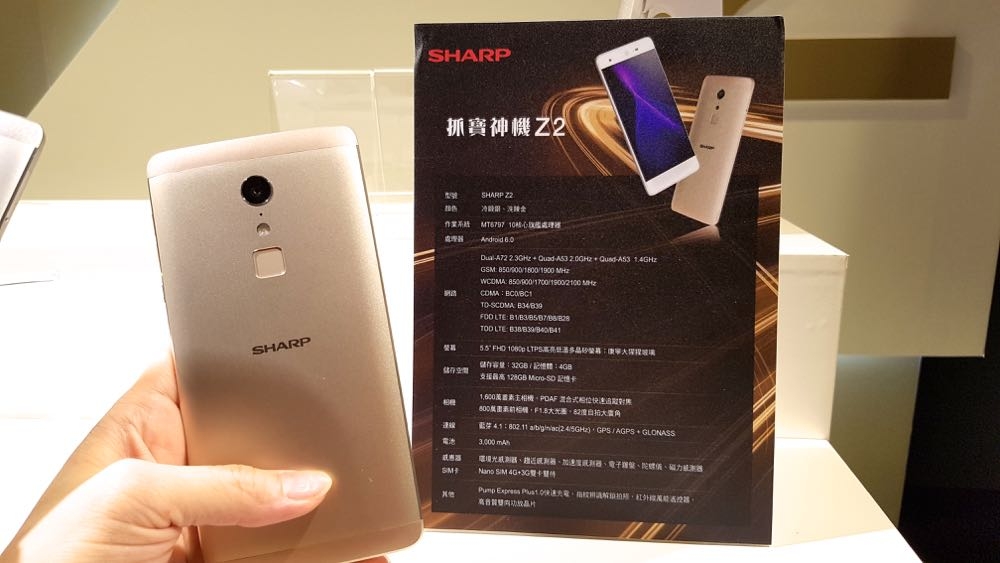 Sharp Z2 有著 5.5 吋 FHD 螢幕、採用 Android 6.0 Marshmallow 作業系統、4GB RAM / 32GB ROM,1600 萬畫素相機與 800 萬畫素前鏡頭,電池容量則是 3,000mAh,並且支援台灣 4G LTE 全頻、指紋辨識與 4G + 3G 雙 SIM 卡,也內建紅外線,能夠連結家中電器成為萬能遙控器。