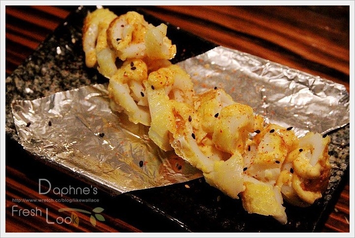 推薦點一個「海膽花枝燒」來嚐嚐,這一道的做法與搭配的食材都很特別,因為花枝一不小心容易烤得太老與太乾,所以先在花枝上抹一層蛋汁,再刷上海膽、美乃滋與清酒的特調醬汁,灑上七味粉,產生鮮美的食感。有別於一般純燒烤、油炸、川燙的料理法,有燒烤的香氣、油炸的酥脆、也保留川燙的鮮美,集三種料理手法的優點。