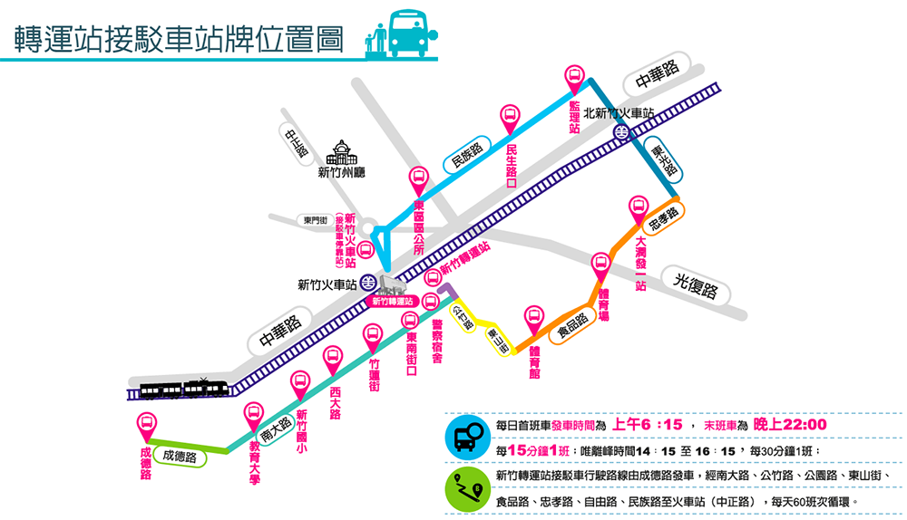 因應國道路線調整,交通處已於7月20日闢駛新竹轉運站接駁車,行經原國道客運路線,該路線由成德路發車,經南大路、公園路、東山街、食品路、忠孝路、自由路、民族路至火車站(中正路),每日60班次循環接駁。上午首班車為6:15發車,15-30分鐘發一班車,末班車發車時間為22:00。該接駁車為免費接駁車,並於8月15日起駛入轉運站,使搭乘更為方便,歡迎民眾多加利用。