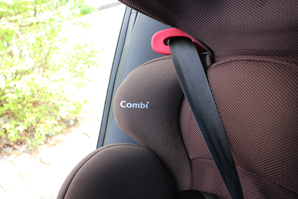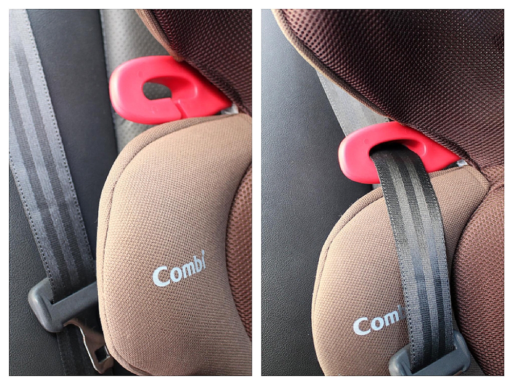 其實真的有夠簡單的,相較於嬰兒用的提籃式汽座設計,這個安裝真的幾乎是等於直接把汽座放到後座上就完成了!後座安全帶先穿過 Combi Buon Junior 的肩部位置可調肩帶導板,然後小朋友坐上後,再把安全帶穿過下方椅座側邊,接著扣上就 OK 囉!