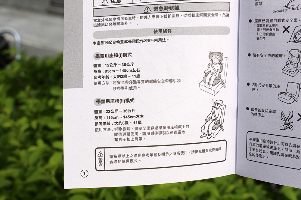 這是一台可以從 3 歲用到 11 歲的成長型汽座,主要有靠背和座墊兩個部分組成,主要依靠後座的安全帶做固定,依照身型和體重的不同,也會有不同的使用方式。