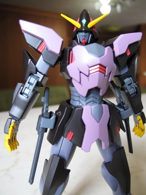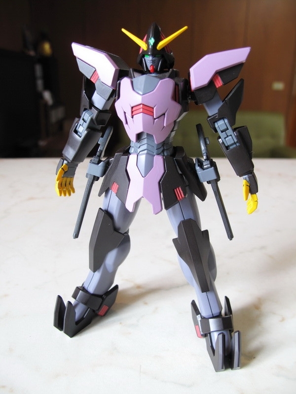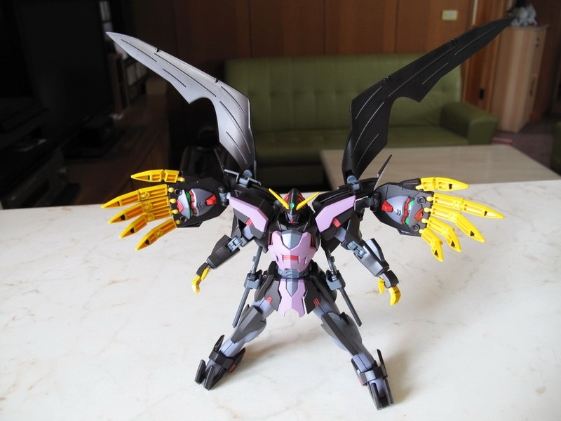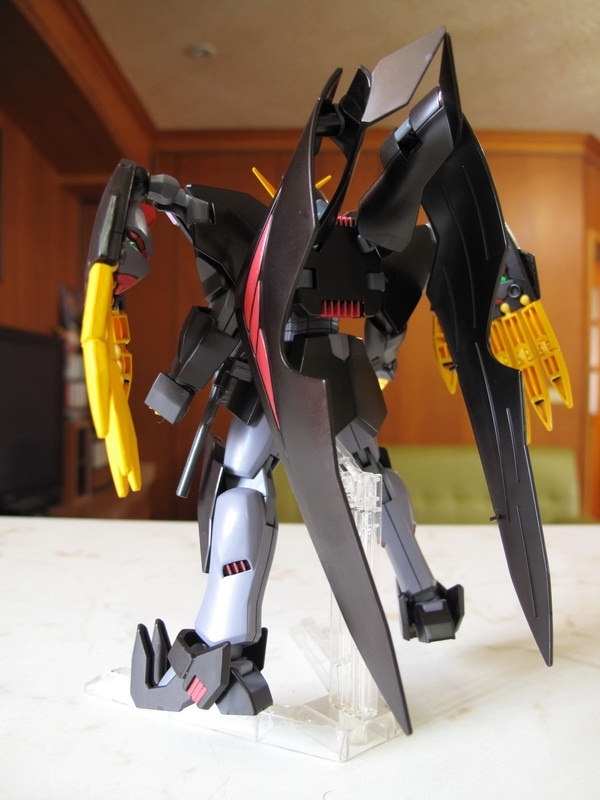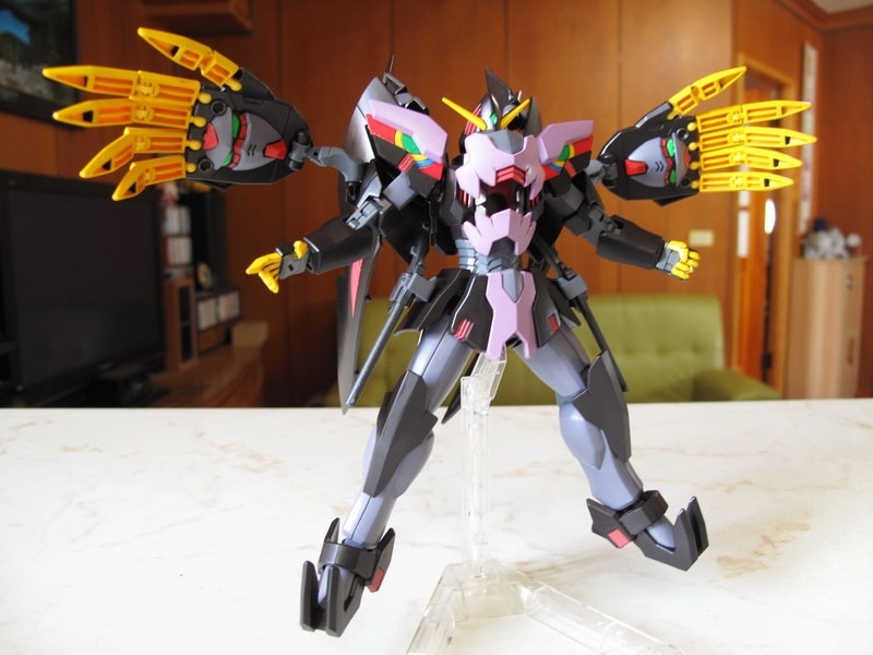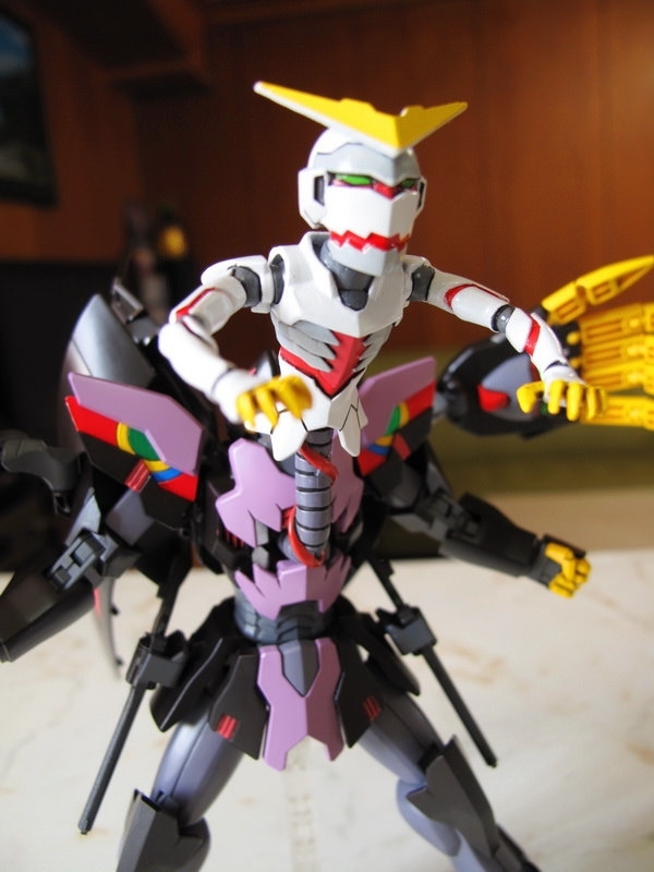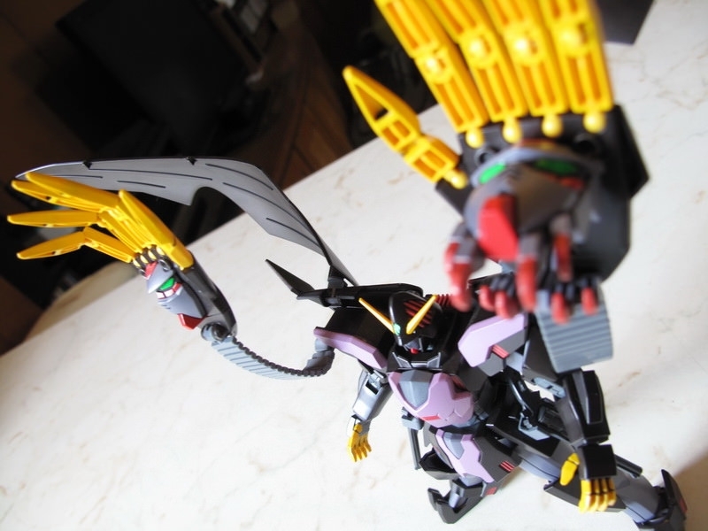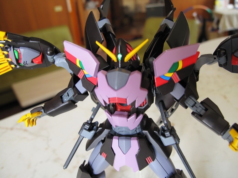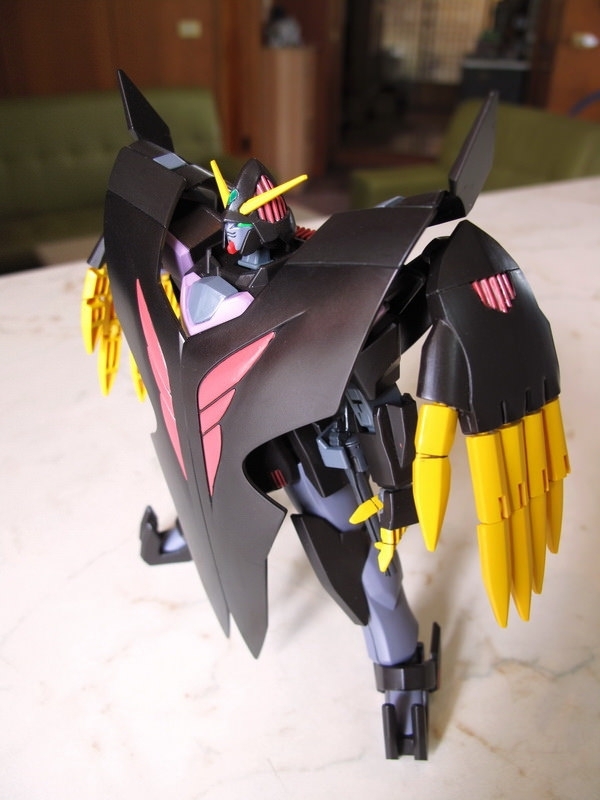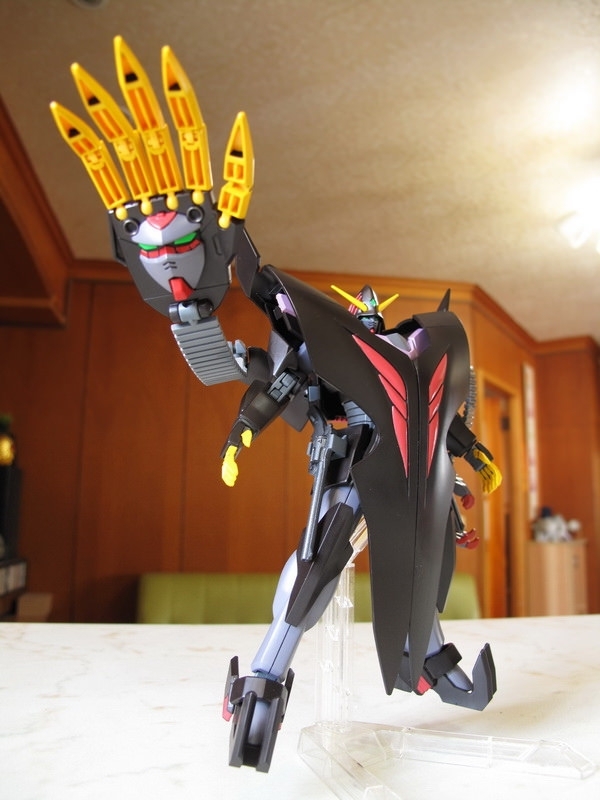 這機體做成模型的時候,最大問題是如何重現那些Gimmick 吧:破披風、能開閉的裝甲斗篷、來自惡魔鋼彈的左右大手,手指射出後的Fang、肩甲、腹部、以及中間暗藏的”一角”,全身都是獨特的機關,令人好奇要如何才能做出來,結果有些放棄有些簡化,但在怪異外型上保持得還不錯,整體來說還可接受。