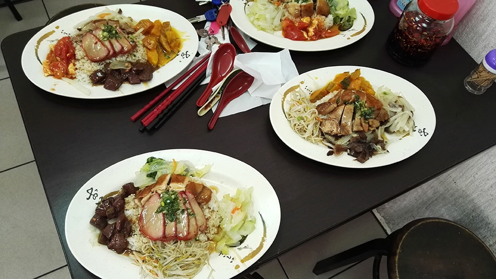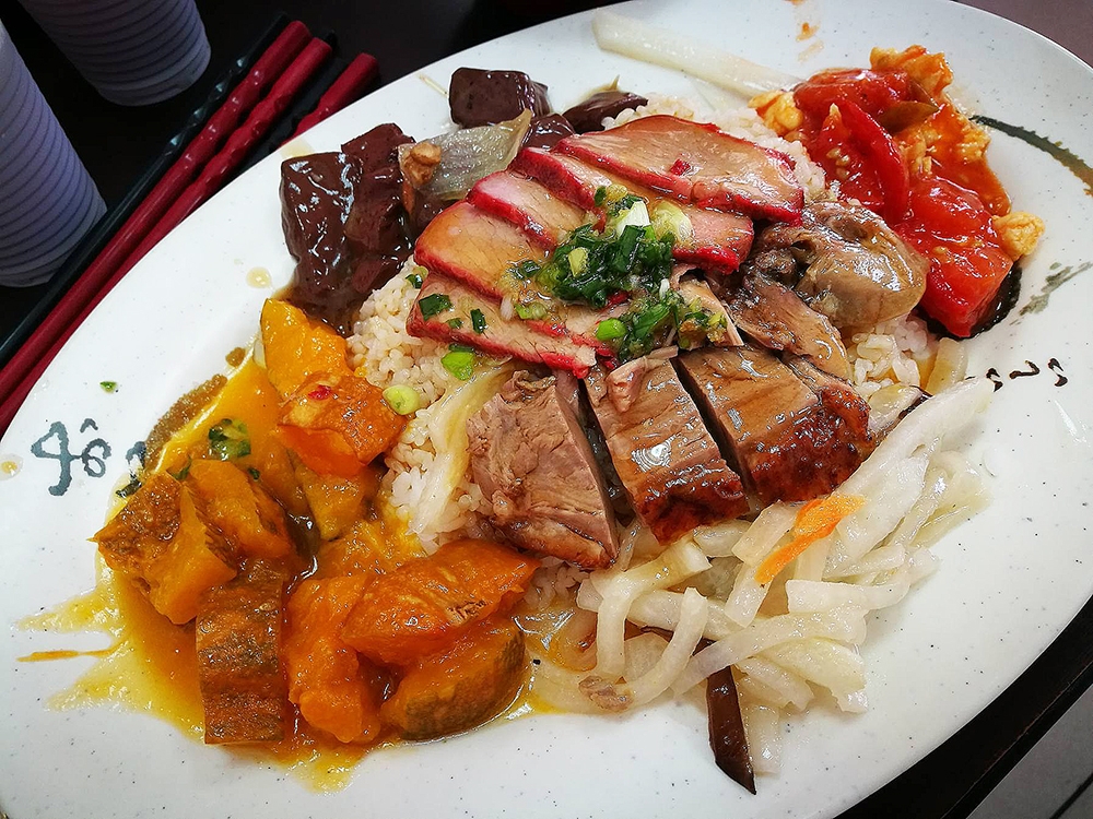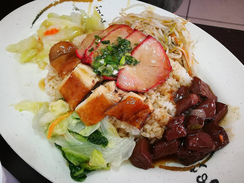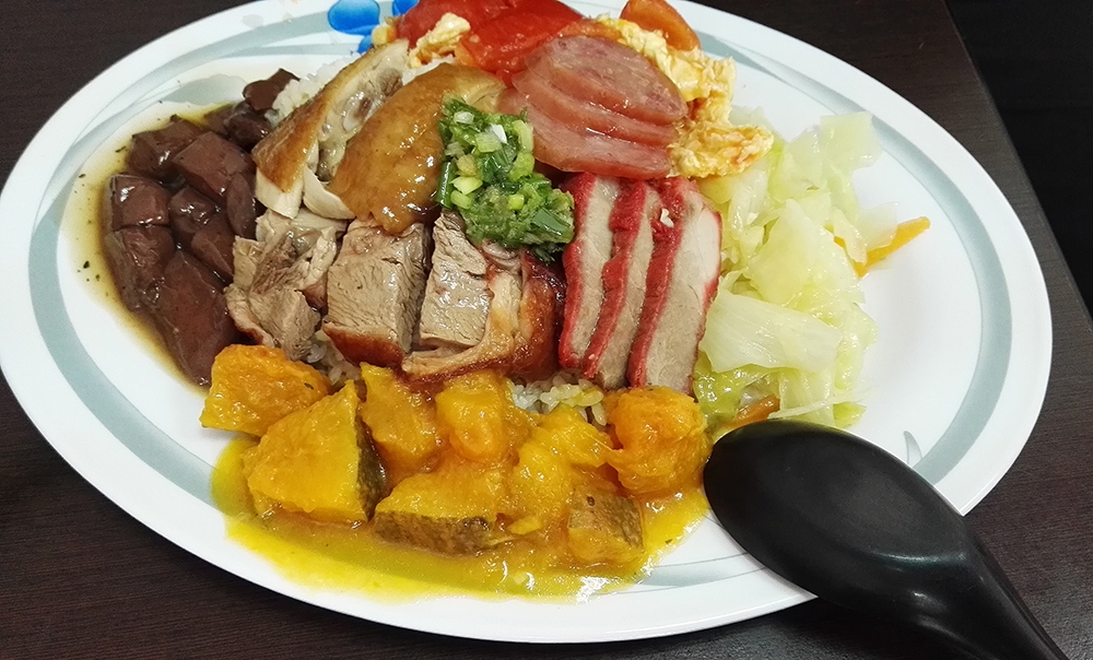 同事小胖因為今天又被老闆凹了,所以怒點了四寶飯,主要有燒鴨、油雞、叉燒和香腸,搭配四道配菜真的是滿滿一盤,端上來看起來是滿驚人的,如果沒有叫老闆減飯,看起來絕對熱量滿點,如同一座小山丘,但小胖還是快樂吃完了!