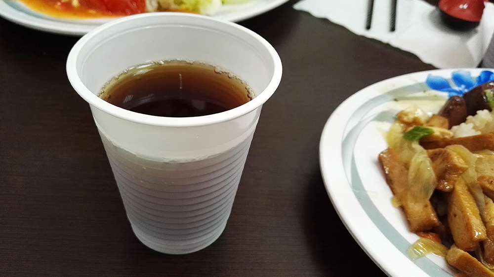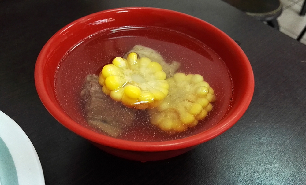 這裡是推薦內用的,畢竟有附湯,看你要喝幾碗都 OK,用料滿多的,而且每天都不太一樣,有時候是紫菜有時候是玉米,重點是裡面還有很多肉(可能是主菜比較用不到的部位去熬的…)