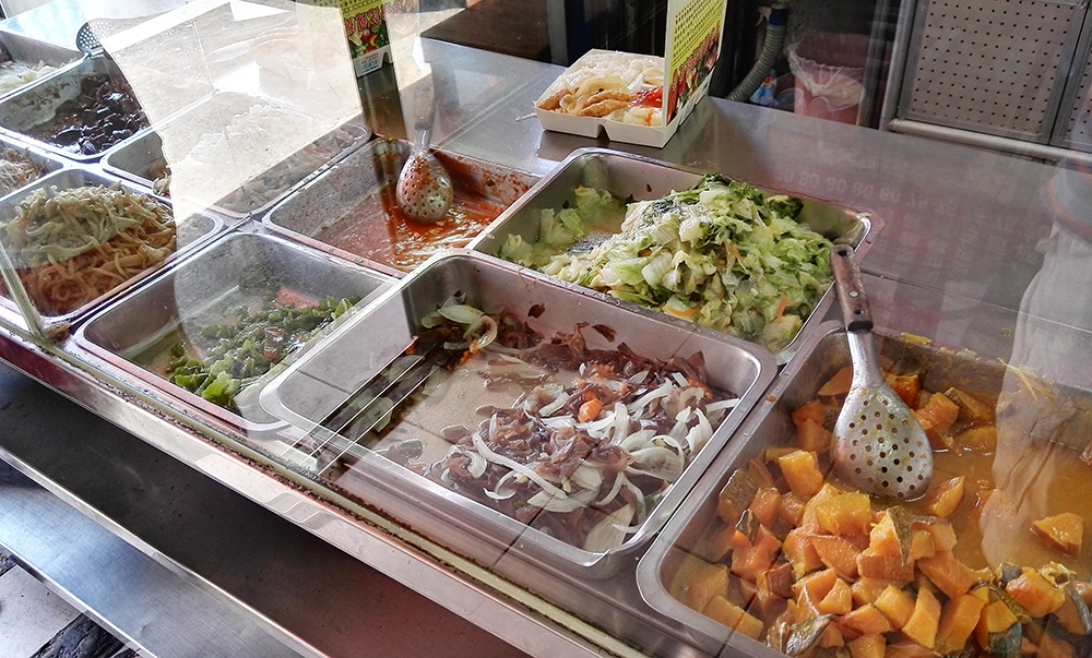 一進去選好要搭配什麼主菜,就可以開始點配菜,一般來說青菜類不會太多,尤其颱風過後可能只會剩一兩樣是青菜,其他都是瓜類、豆腐或豆芽菜系列,而這邊可以點四樣配菜,以價格來說算是還 OK 的。