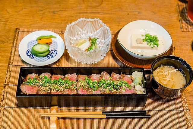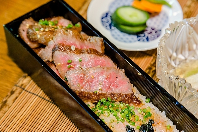午餐提供的是定食,晚餐則是預約式的無菜單料理。我當然選的是「炙燒豐後骰子牛」便當。說是便當但不能外帶就是了。