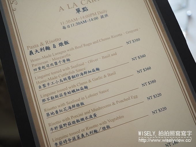 餐點的消費平均約NT300~500左右,來嚐他們的商業午餐其實是滿划算的,而單點的燉飯及義大利麵類差不多也在NT350上下,其實也算是合理的數字~其它像是飲料與甜點等等,大約也在NT200~300之間。