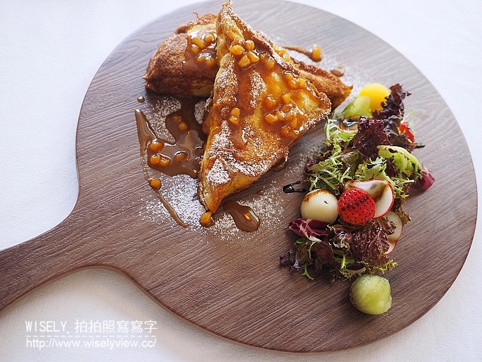 這 道『濃情太妃糖蘋果法式吐司』端上來時,其實我們兩人已經飽到不行沒法子吃完了~雖然法式吐司本身的奶蛋香很突顯,並且太妃糖醬汁搭炒蘋果碎也很吸引人, 不過一直在吃澱粉真的滿撐的,但它屬於早午餐的內容,有興趣的朋友可以點來嚐試,其吐司和沙拉的外觀也很漂亮,但若有點培根串我覺得會更棒。