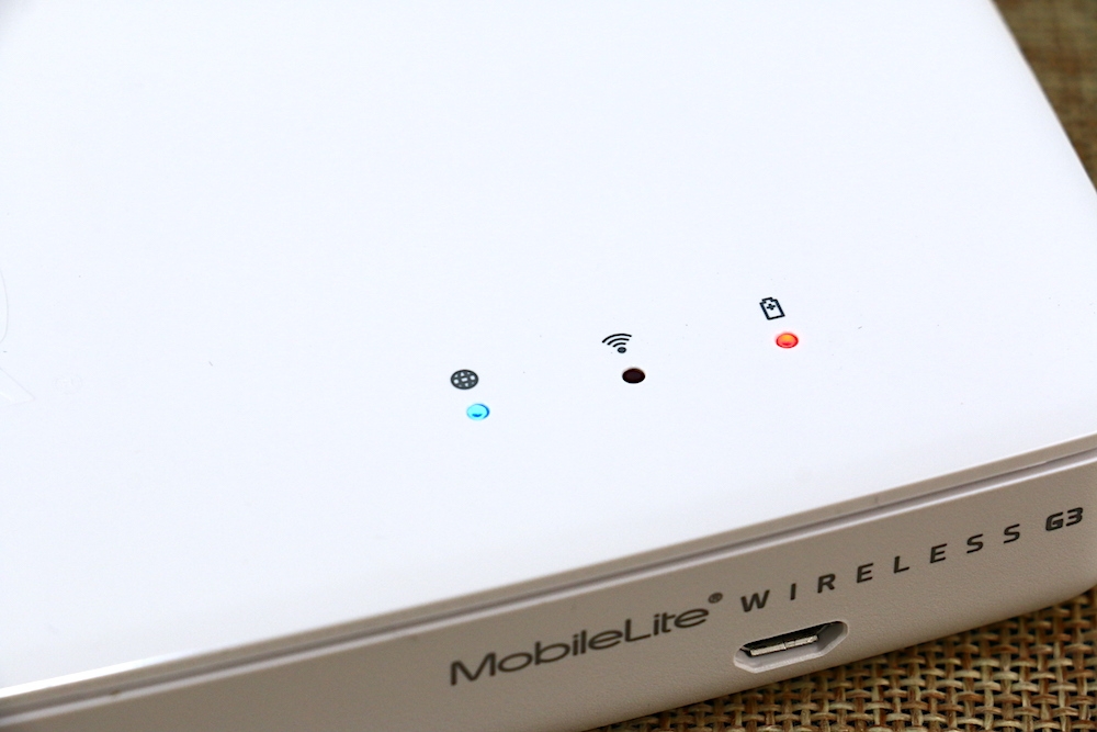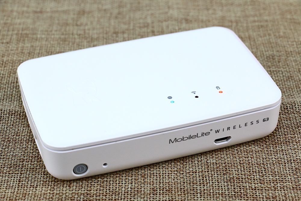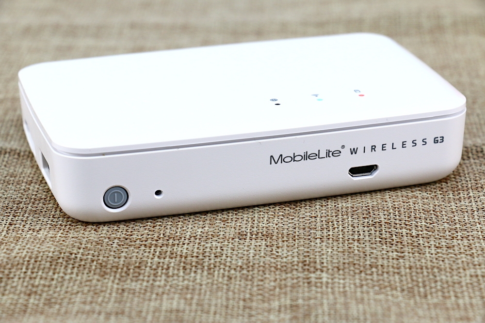 MobileLite Wireless G3 的機身側面則是設有電源開關,以及 MobileLite Wireless G3 產品名稱與 micro USB 充電孔。