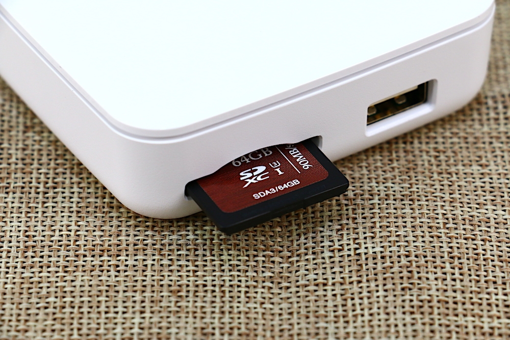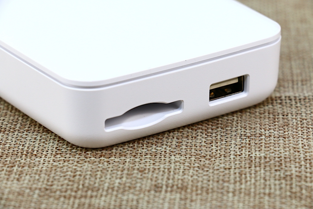 因 MobileLite Wireless G3 具備隨身硬碟、行動電源功能,所以在機身的左側設有 SD 記憶卡插槽與 USB 電源輸出孔。