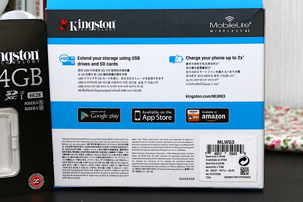 要了解 MobileLite Wireless G3 的特色,首先要從他的包裝開始看起。MobileLite Wireless G3 的包裝後面,除了敘述整個產品具有的無線儲存功能、行動電源功能之外,下方還有提示 MobileLite Wireless G3 專用的 MobileLite Wireless App 下載位置,若用戶有必要使用到無線隨身硬碟,可至 Google Play 商店、App Store 中下載。