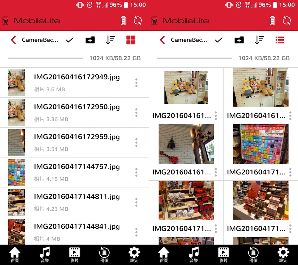 在照片預覽方面,除了一般常見的縮圖並帶檔案資訊的呈現方式之外,MobileLite Wireless App 還支援預覽圖示功能,讓整個照片預覽的方式變得更加簡單。