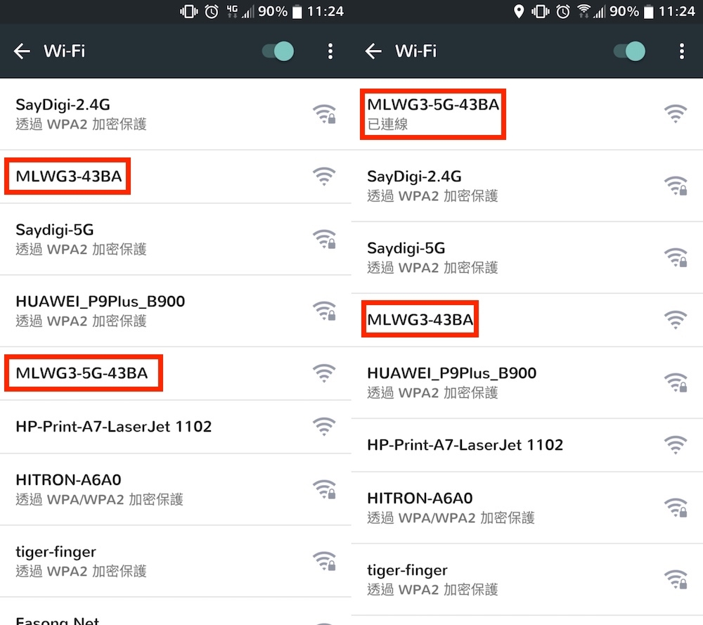 只要將 MobileLite Wireless G3 開機,並啟動手機的 Wi-Fi 功能,就能自動抓取由 MobileLite Wireless G3 發送出來的 Wi-Fi 訊號。值得一提的是,MobileLite Wireless G3 提供了 2.4GHz 與 5GHz 兩種 Wi-Fi 訊號,用戶可以依照設備支援程度來選擇。