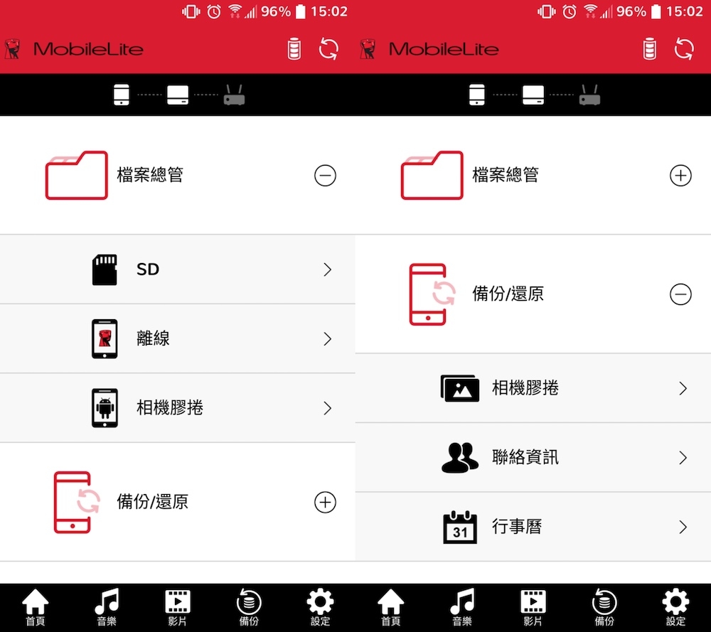 新版的 MobileLite Wireless App,僅有檔案總管與備份/還原兩個圖示,以介面設計來說相當簡單好上手。值得一提的是,檔案總管中還支援儲存區域個別讀取功能,而備份/還原則是可以針對各種資料進行獨立備份/還原,讓用戶可以依照自己的需求來使用。