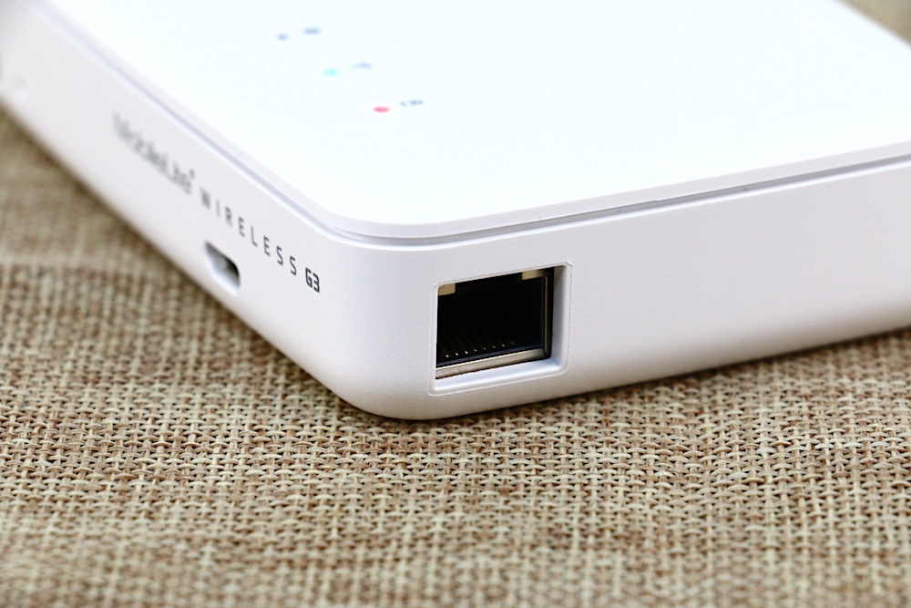 MobileLite Wireless G 的機身右側則是設有 LAN 網路線插槽。值得一提的是,MobileLite Wireless G3 的 LAN 插槽支援 2.4GHz 802.11b/g/n & 5GHz 802.11ac 高速連線,若想體驗高速無線上網,可將 MobileLite Wireless G3 接上 LAN 網路線。