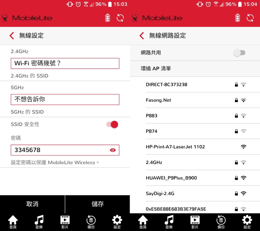 除了可以針對各種檔案進行備份/還原之外,MobileLite Wireless App 還能進行 MobileLite Wireless G3 細部設定,比方說 Wi-Fi 的名稱與密碼等,讓 MobileLite Wireless G3 的無線儲存空間不被他人任意使用。此外,MobileLite Wireless G3 還具有 Wi-Fi 網路分享功能,只要透過 MobileLite Wireless App 將無線網路設定好,這麼一來就能讓所有連線至 MobileLite Wireless G3 的裝置都能有更穩定、順暢的 Wi-Fi 無線網路連線品質。