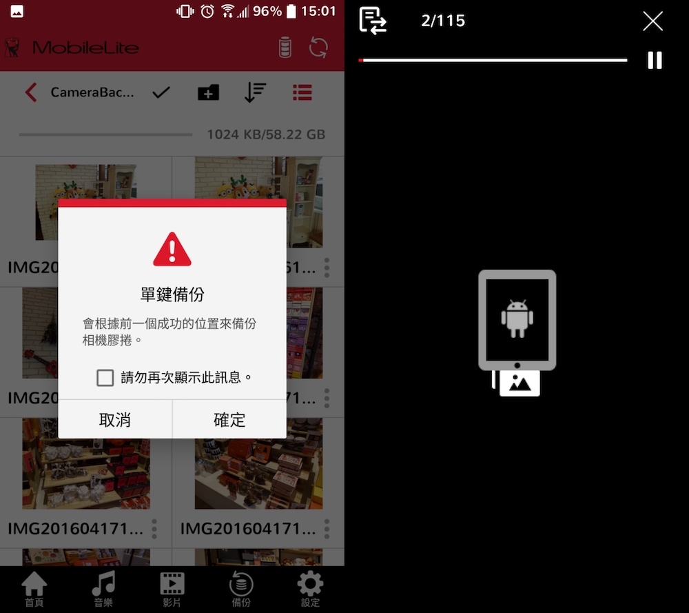 如果,您的手機照片過多,不知道該從何開始備份,也可以透過右下角的單鍵備份來進行所有檔案的備份。使用方法相當簡單,只要按下單鍵備份後,MobileLite Wireless App 就會跳出單鍵備份的提示,按下確定系統就會自動備份手機中的所有照片。