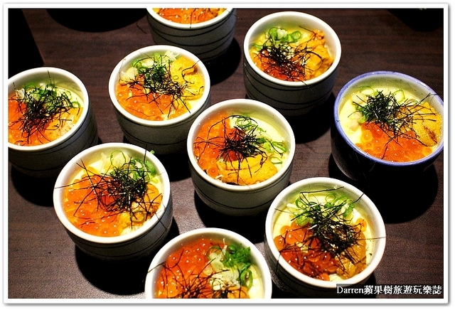 海膽玉子蒸上頭有著海膽和鮭魚卵,玉子蒸吃起來綿密厚實,搭配上鹹鮮的鮭魚卵與海膽簡直太棒了
