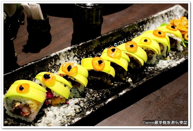 拍起來視覺效果不錯的綠色毛毛蟲壽司捲,壽司吃起來清爽好吃,再吃那麼多道下來有種爽口解膩的感覺