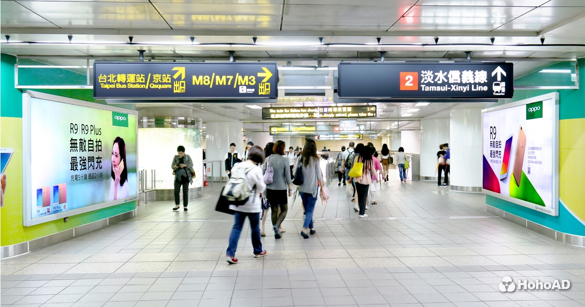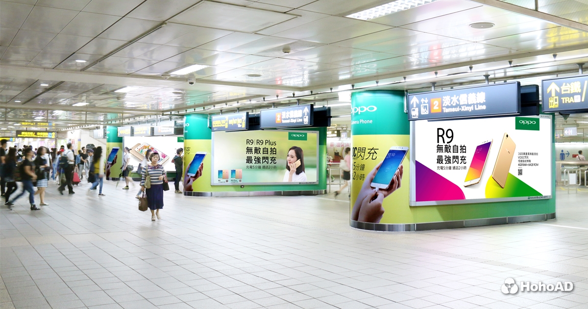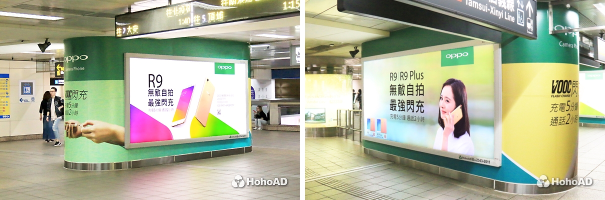 這回 OPPO 目標在於讓產品概念完整一致,希望社會大眾心中的這層基礎印象,可以更加深入、清晰,進而建立信任,對商品買單。於是他們選定了人潮絡繹不絕的捷運台北車站,在熙來攘往的板南、淡水轉乘層中心橢圓柱上,利用燈箱與壁貼,創造出與品牌形象相互符合的廣告。