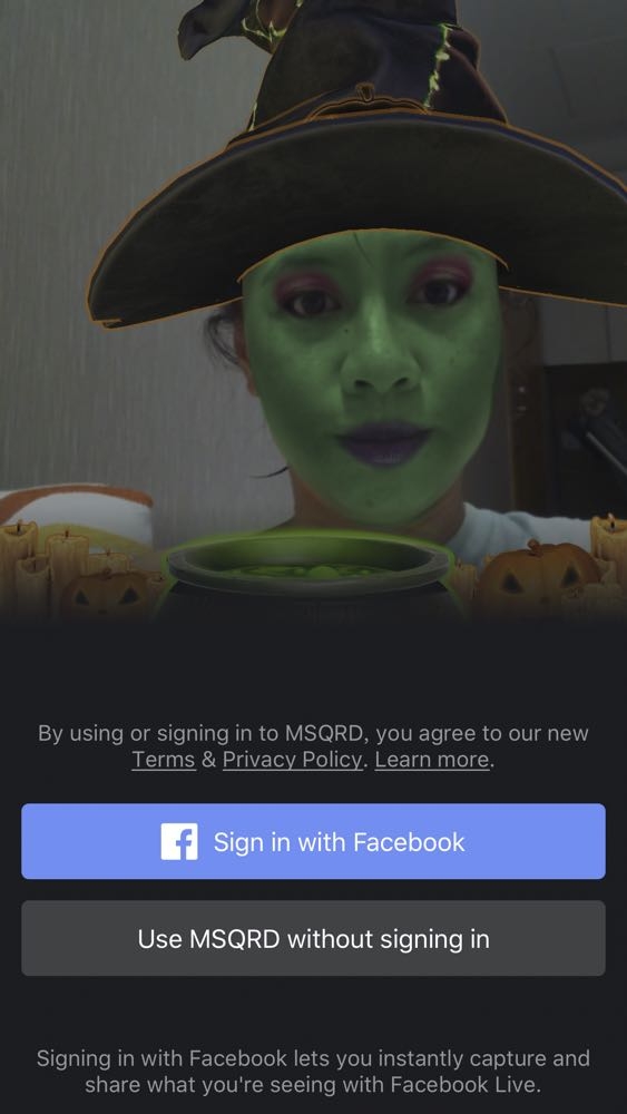 不過要如何在 Facebook 的直播時為自己戴上頭罩呢?! 請記住兩個缺一不可的要點: (1) 使用 iOS 裝置; (2) 從 MSQRD 進入。