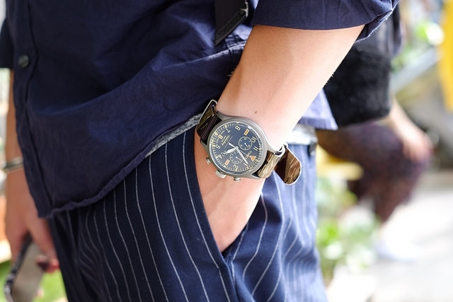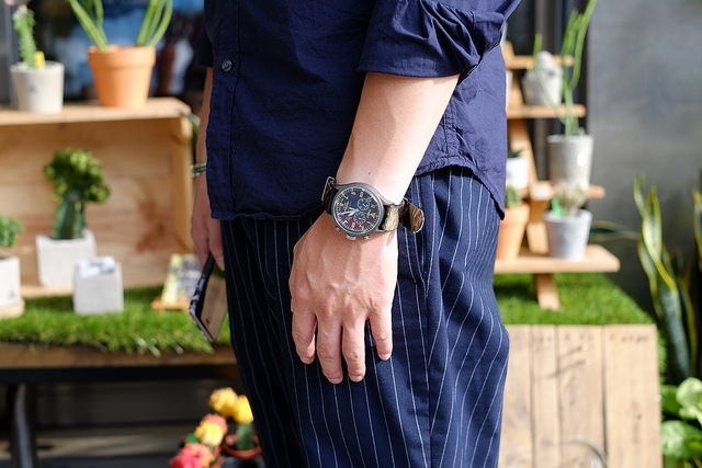 古銅色錶殼、深藍色錶盤加上原本就是飛行錶的外型設計,換上軍事風的虎紋迷彩錶帶也很搭。