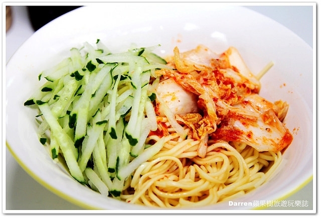 涼麵上有大量的小黃瓜和泡菜,尤其是泡菜給的量算很多,這樣可以讓麵條充分都沾到泡菜味很棒
