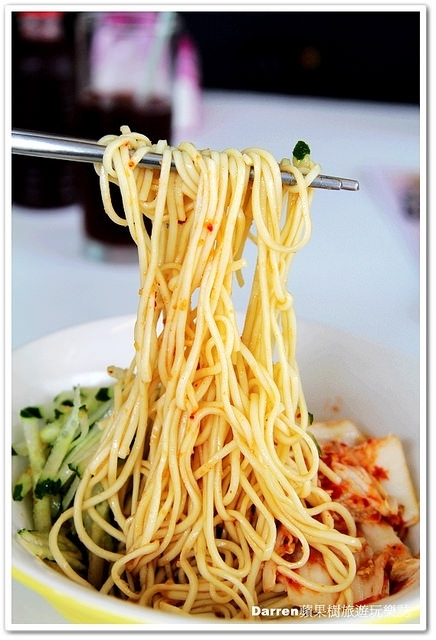 夾起大把涼麵麵條表面沾附泡菜湯汁及醬料,入口時是表面的泡菜滋味然後咬兩下麵香出來了很好吃