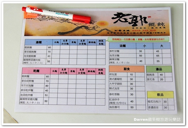老郭餛飩的MENU,主要以麵食為主有湯麵、乾麵及涼麵,涼麵有眷村涼麵、泡菜涼麵、麻辣涼麵