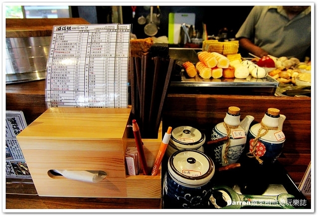 我選擇坐在板前,上面掛滿許多木牌都是關東煮的品項,這選擇也太多了一開始還不知道要點些什麼