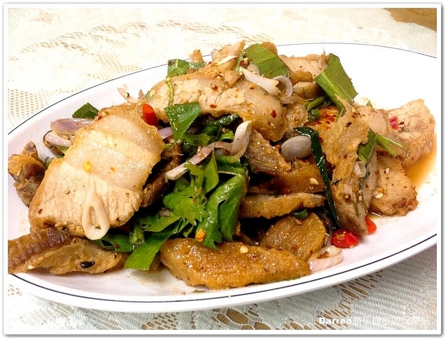 在豬肉片上面一粒粒是炒米粒加上薄荷和辣椒,三層肉外皮香脆嫩口,調味上走香辣路線很不錯吃