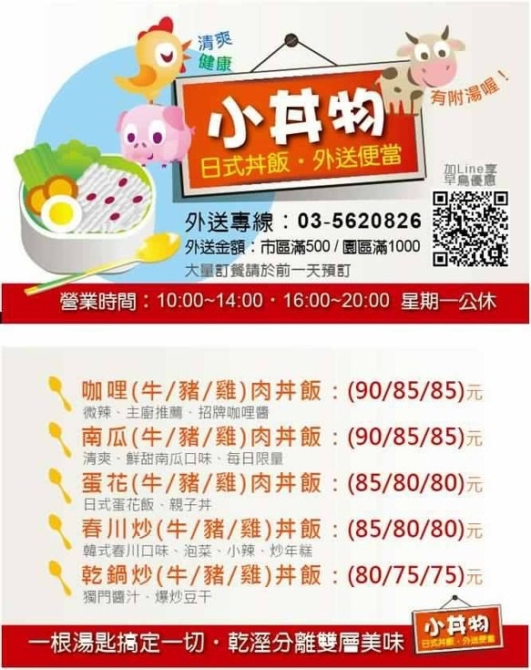 牛牛在馬偕工作,午餐大多和同事一起訂外送便當,吃來吃去都是那幾間,真的都吃膩了,終於有新選擇了,目前小丼物為星期一公休,如需訂購可先打電話詢問一下