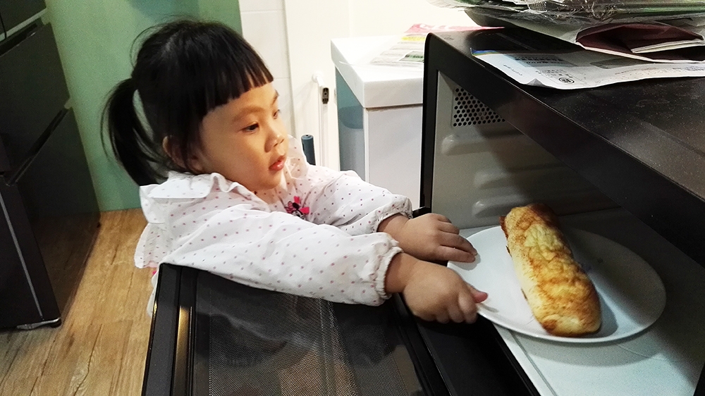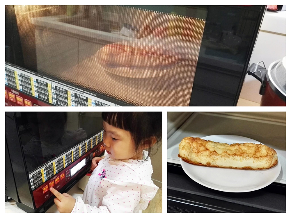因為看到「搖滾起司麵包」的包裝上面寫著「熱熱吃更美味」,所以決定先拿去水波爐加熱一下,當然記得要先洗手,請不要學我女兒這樣(喂)