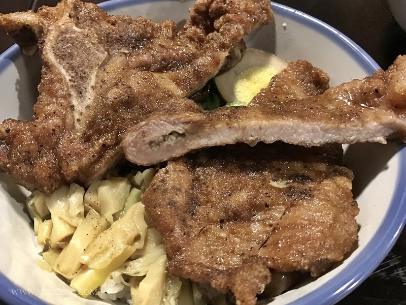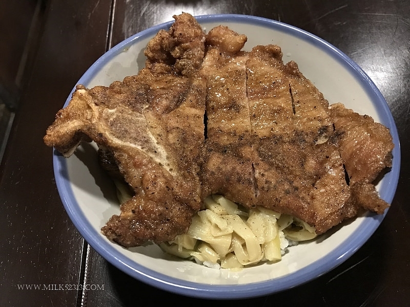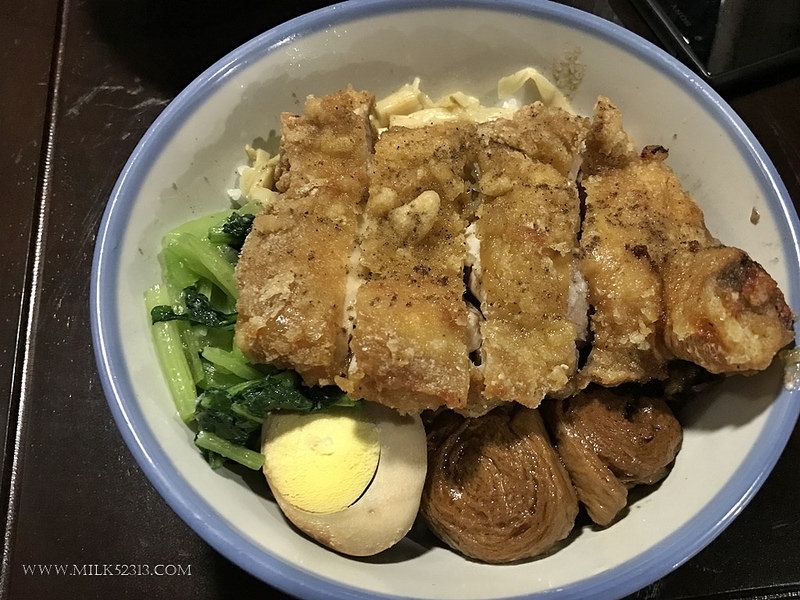 大約一個巴掌大的炸排骨,看的出來並沒有特別敲薄,口感還不錯,但總覺得可以炸的再酥一點會更好,搭配筍乾、青菜、滷麵筋、滷蛋等配菜,用一個大碗公裝著,感覺特別有份量,這種大碗公飯,其實就是台灣早期農忙時期的割稻仔飯