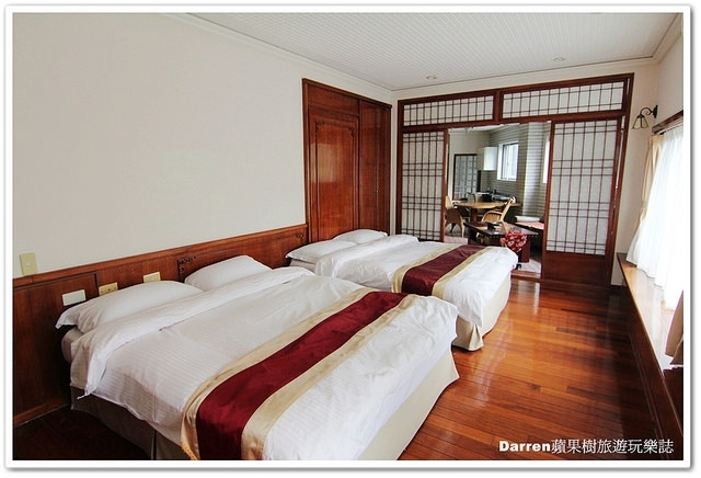 和式臥室以木地板搭配2張大床,床舖睡起來柔軟好睡,還有一整片的窗景拉上窗簾有自然光很舒適