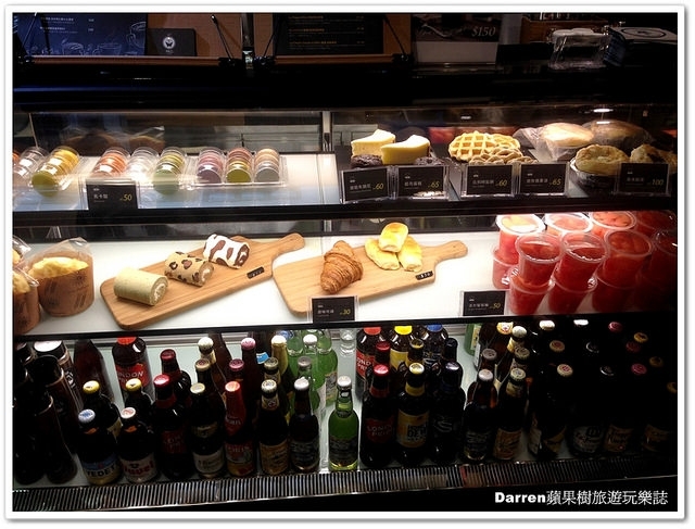 冷藏櫃裡有馬卡龍、蛋糕、麵包,還有啤酒、飲料等