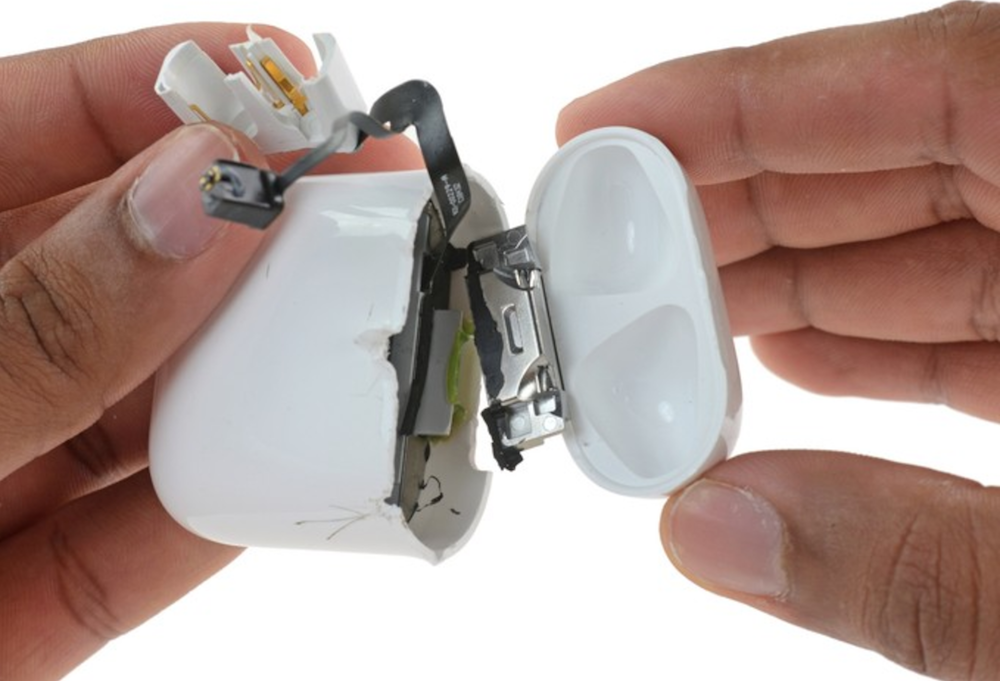 根據國外知名拆解網站 iFixit 的拆解分析報告指出,蘋果的 AirPods 是款幾乎不可能進行維修的產品,由於 AirPods 的緊密設計,以及大量使用黏膠來固定所有內部元件與外殼,因此 iFixit 進行拆解時,罕見的動用刀片來進行結構破壞拆解。而內部的元件也因大量黏膠固定,以及外殼結構因刀片拆解而造成損壞,iFixit 也判定這款 AirPods 無法進行零件拆解更換,罕見的給出不可能維修的「0 分」分數,說明 AirPods 是不可能在不破壞外殼與結構的情況下進行維修。
