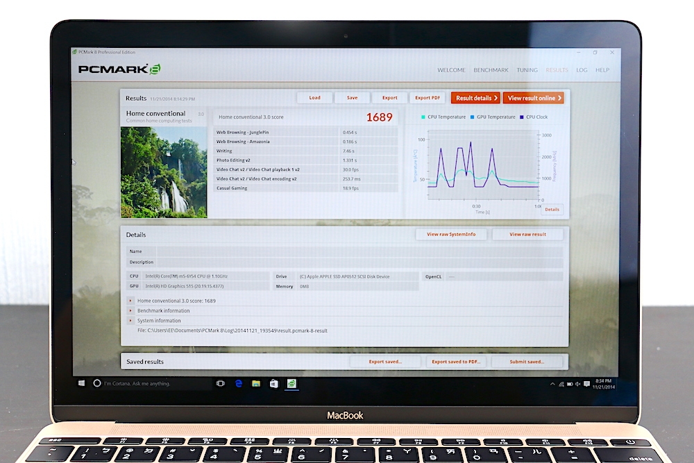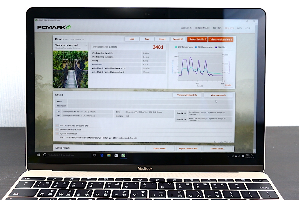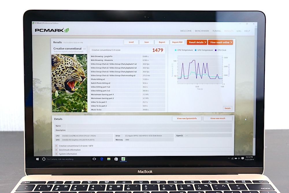 從 PcMark 8 的跑分成績來看,MacBook 在 Creative 的項目中拿到 1479 分、Home 的項目中拿到 1689 分,而 Work 的項目中則是拿到 3481,明顯比 ZenBook 3 的 Creative:3868、Home:3186、Work:3128 的成績低很多。若習慣 Windows 作業系統,且希望也能擁有像 MacBook 一樣的極致輕薄,ZenBook 3 是個不錯的選擇。