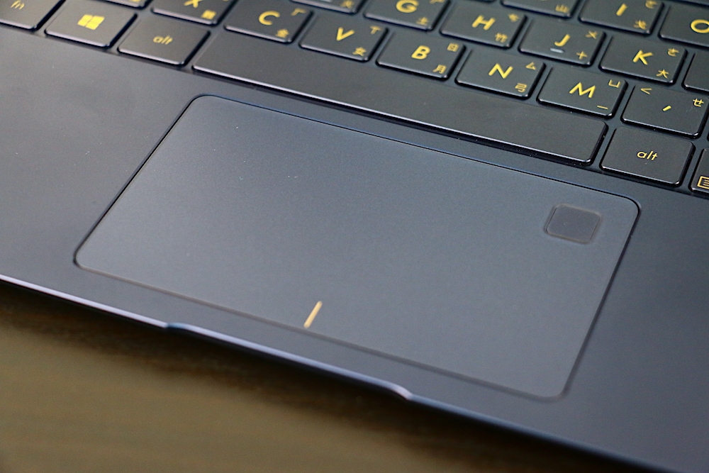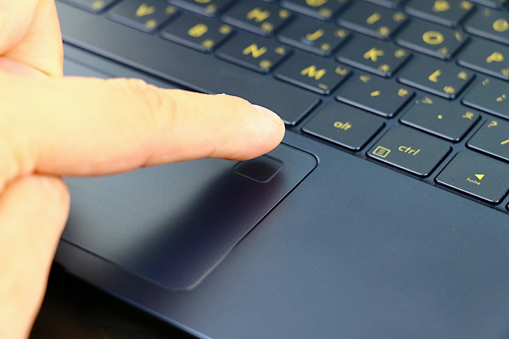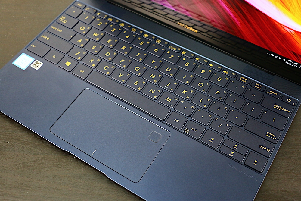 鍵盤與觸控板方面,ASUS ZenBook 3 採用全尺寸背光鍵盤,鍵盤與機身邊框僅有 2.1 mm 的寬度。而每個按鍵中心點之間的間距為 19.8 mm,與桌上型電腦的鍵盤按鍵間距相同,而這樣的間距設計,也讓使用者有如在桌上型電腦鍵盤上打字一樣舒適。如果大家眼尖的話應該有發現,鍵盤的顏色與機身是同色的,搭配金色的鍵盤字體,整體撞色設計的一致性非常高。