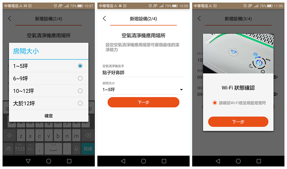 這裡可以先選擇房間大小,並幫你的清淨機設備取一個名字吧!因為可以同時管理多台 BRISE 空氣清淨機,所以我們可以在不同的環境設定不同的名字,方便未來進行管理!