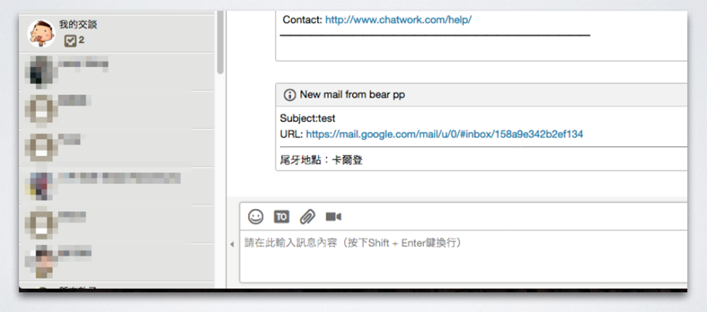 最近發現更厲害的是還能跟 Gmail 和 Google 日曆的功能結合,當天也有分享這個新招給大家,只要透過 Zapier 這個服務就可以囉!只要 ChatWork 與 Gmail 連結設定完成,在 ChatWork 上我們就可以直接在設定好的收件群組確認 Email 內容,有興趣設定的朋友可以參考這個官方教學囉!還滿實用的呢!