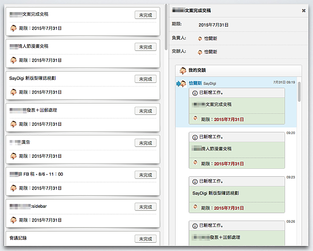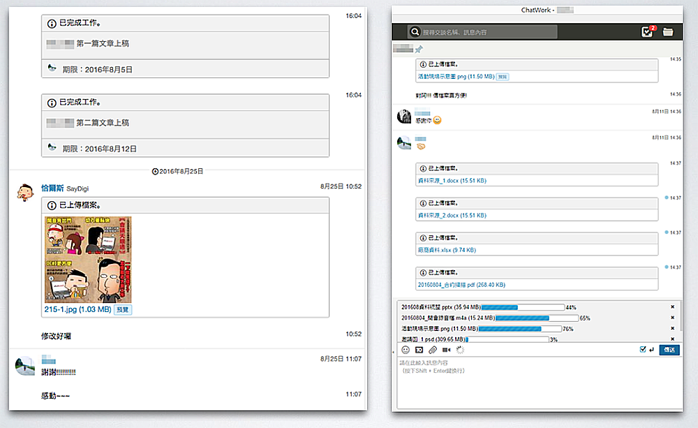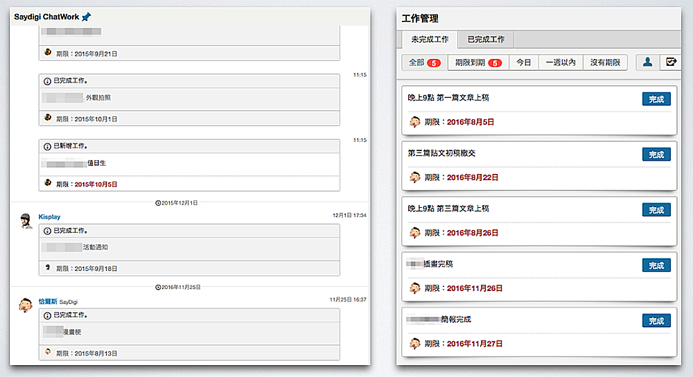 小恰自己很推薦 ChatWork 的群組功能,相較於其他的通訊軟體,ChatWork 這個雲端會議室真的是設計來「工作」的,平常 PM 要交辦事情的話也是讓下面的人一目瞭然!我只要拉到工作管理,看我「未完成工作」就可以了,當做完時按下「完成」就超有成就感的啦!