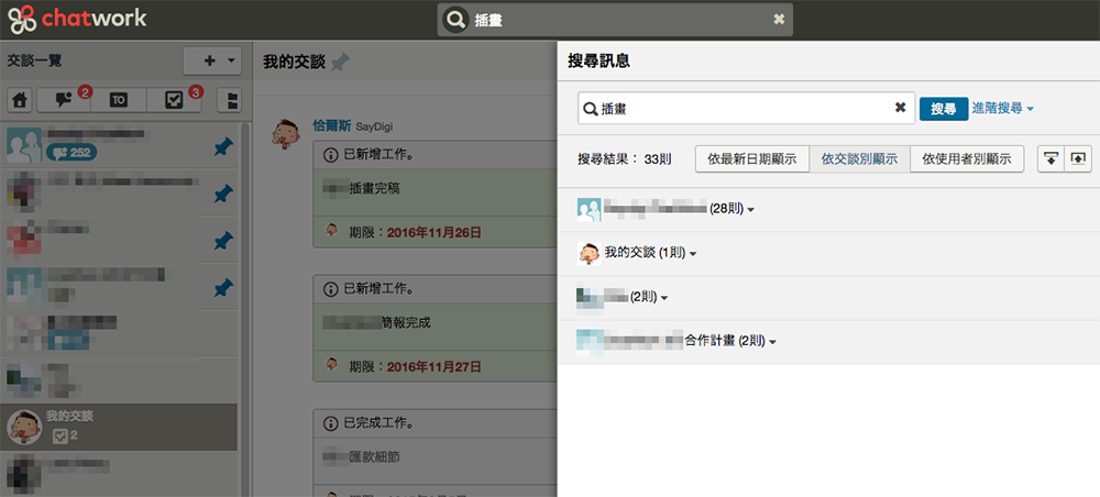 我這裡大推 ChatWork 清楚明瞭的設計,從專案和時間軸的排列,讓我很快就找到當初的 Case,連負責人和交辦人都清清楚楚的,當初新增的工作、附件或交辦事項都保留地很完整,讓你一分鐘內就能找到你要的關鍵資訊!