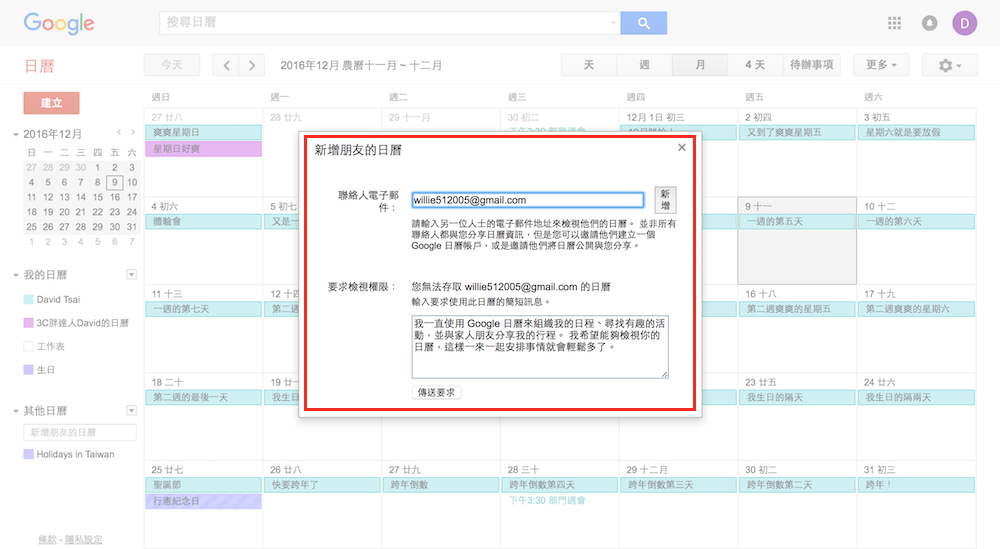 如果對方沒有公開日曆,你可以向對方送出要求,請他們與你共用日曆。對方如果與你共用日曆,你就會收到電子郵件。接著,就可以在自己的 Google 日曆中查看對方的完整行程。