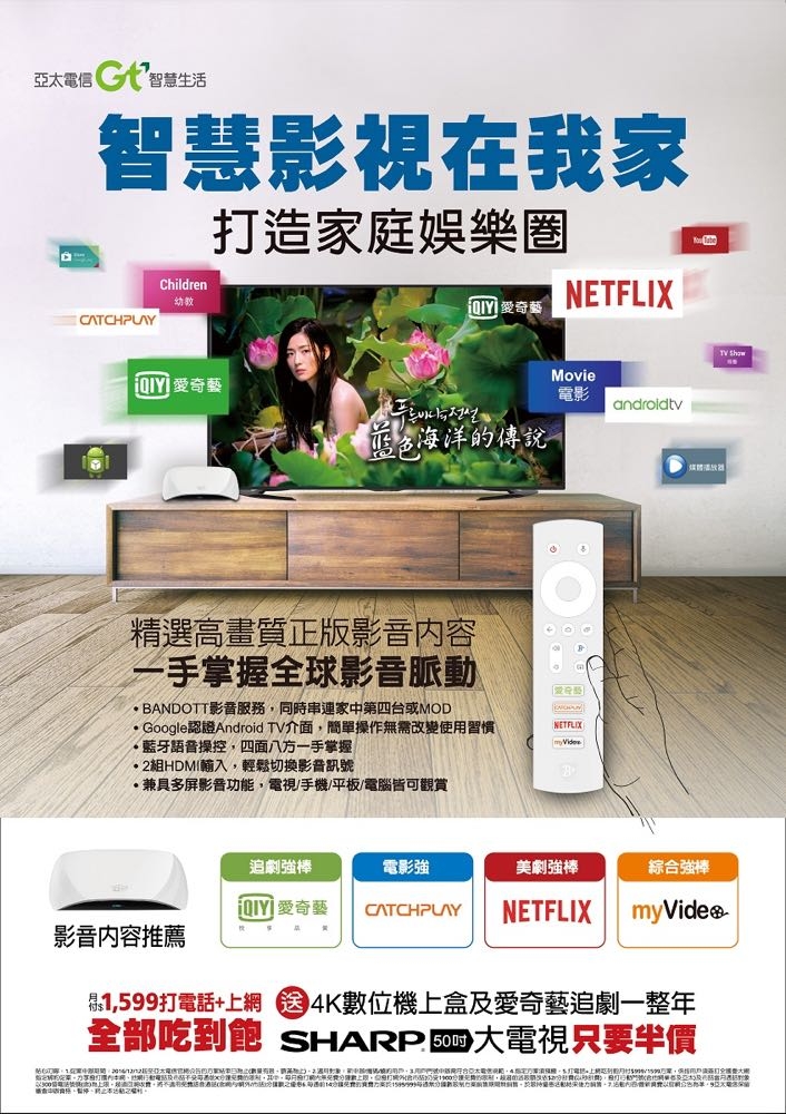 亞太電信也觀察到「影音匯流」從個人進入家庭的趨勢,繼今年 5 月先推出「Gt 行動電視」影音服務後,於今(12)日又正式引進「BANDOTT」影音服務(中文產品名:便當包飯),搭配專屬 4K 數位機上盒,即可在家中透過大電視,享受精選高畫質正版影音內容,一手掌握全球影音脈動。