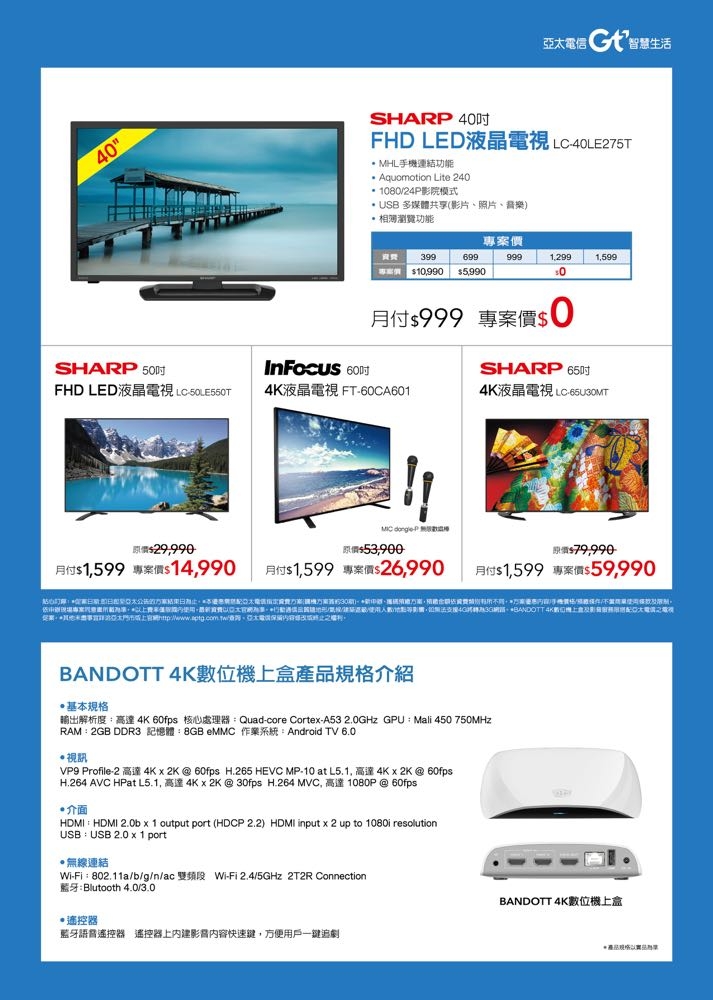 「BANDOTT」(便當)影音服務提供愛奇藝、CATCHPLAY、Netflix、myVideo 等四大高畫質影音平台,又可一鍵切換至家中有線電視或 MOD,滿足消費者追劇、電影、美劇等需求;現在推出限時搶購活動,凡申辦亞太電信 4G 門號,月付只要 NT$1,599,SHARP 的 50 吋大電視,就可以半價帶回家;月付只要 NT$999,SHARP 40 吋電視,更是 0 元帶回家,同時再送愛奇藝免費收視 12 個月或 CATCHPLAY 6個月;「BANDOTT」(便當)影音服務上市初期限時搶購,立即開賣,消費者可以直接到活動網頁留下資料,亞太電信將派專人與消費者聯繫;亞太電信Gt智慧生活網路門市同步開賣。(BANDOTT影音服務說明網頁http://event.aptg.com.tw/20161120/,搭配終端資費表請參考附件二)