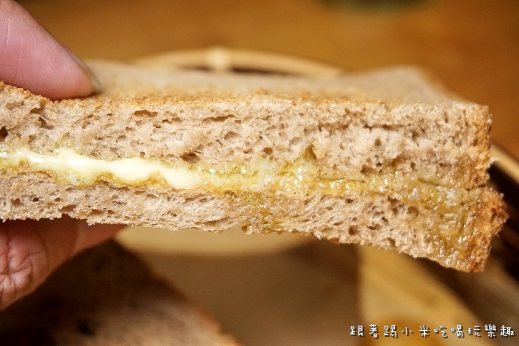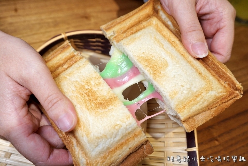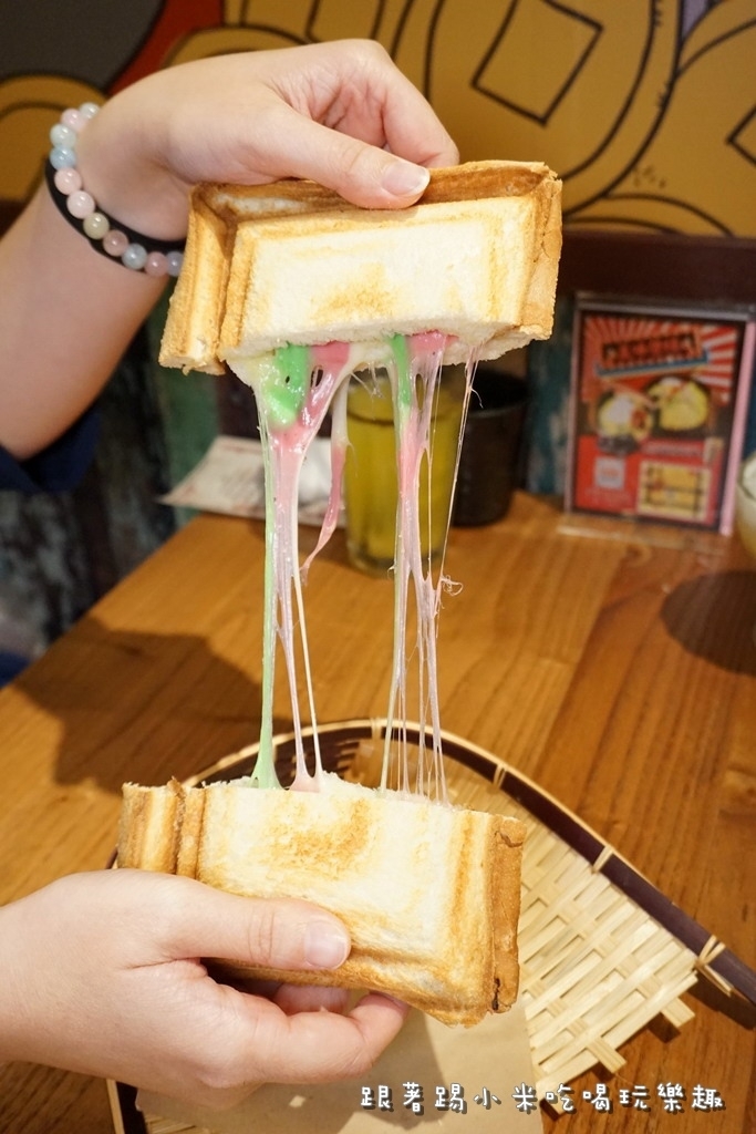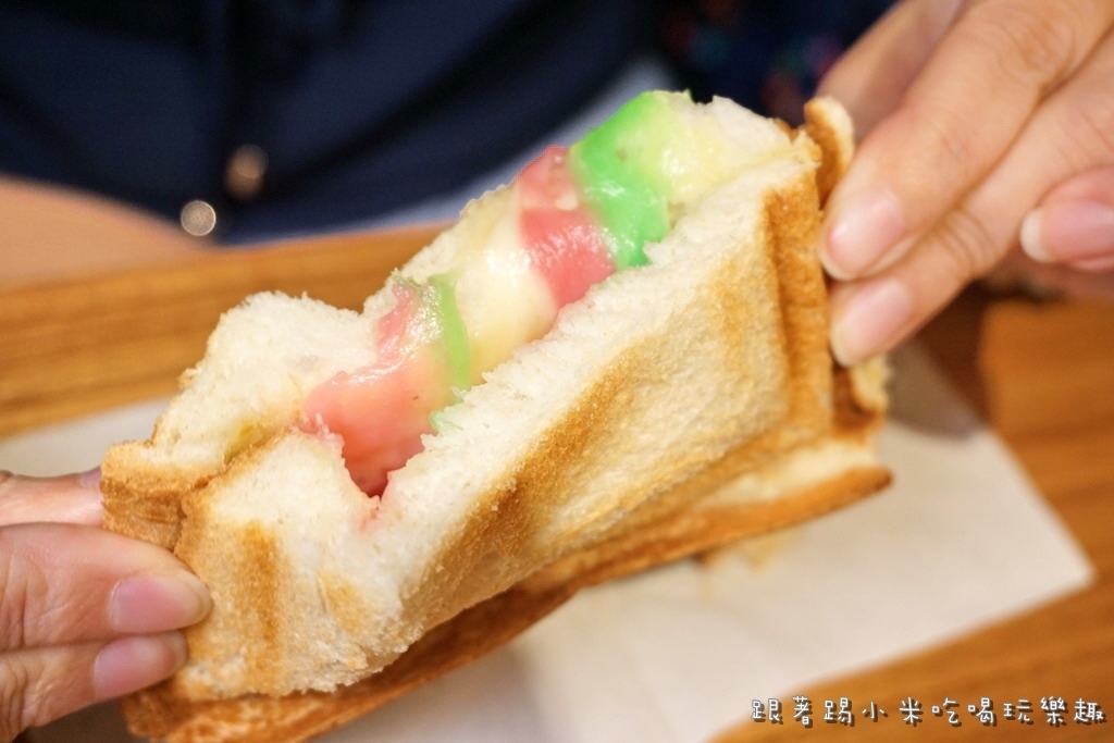 最後要來試一下他們很夯的彩虹繽紛起司熱壓吐司(90元), 價格上有一點不便宜, 聽店員說是因為他們用的是不含色素香蘭葉(綠)及火龍果(紅)來製作起司, 小米發現DM上也是這麼說, 大家參考看看囉